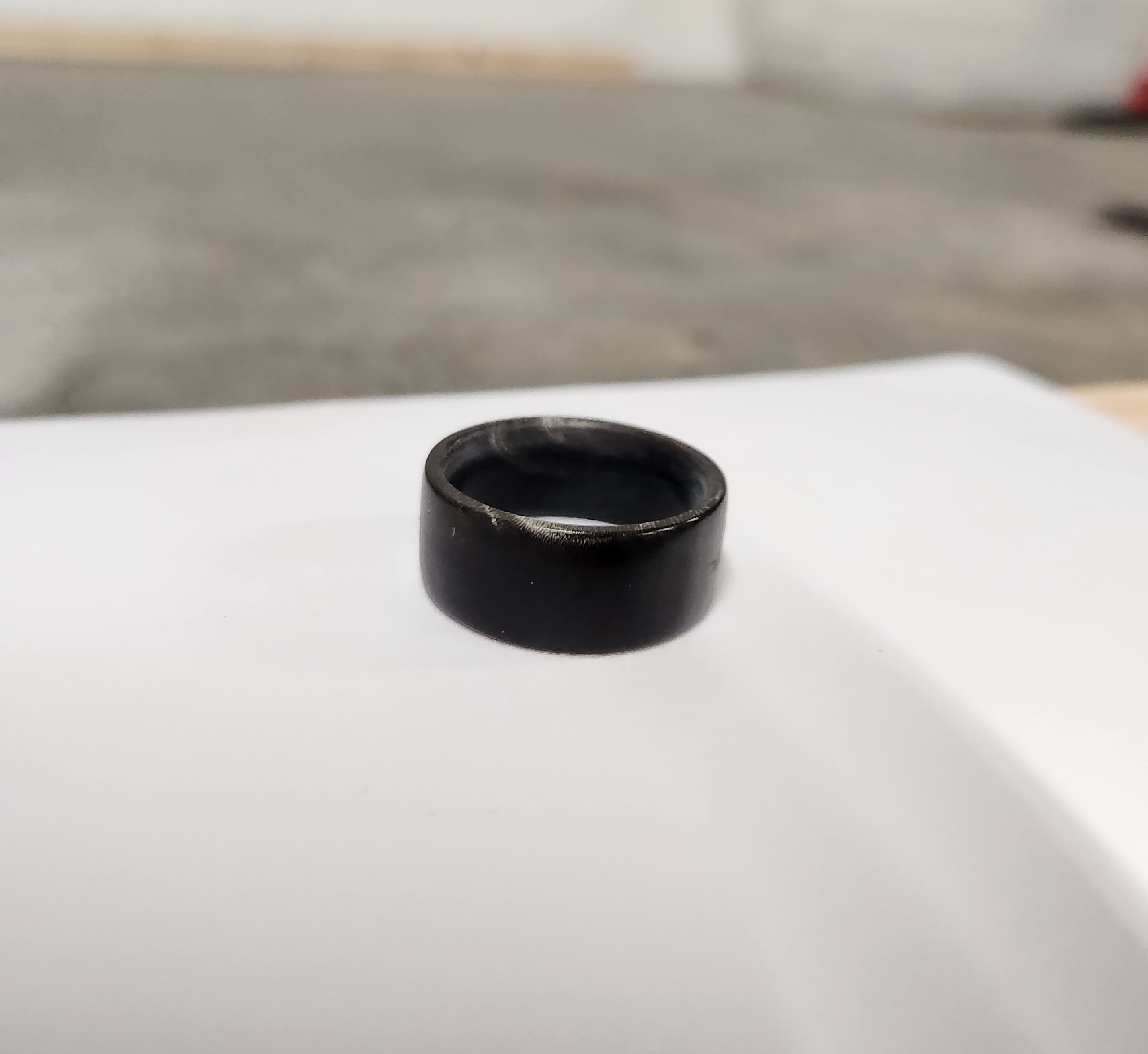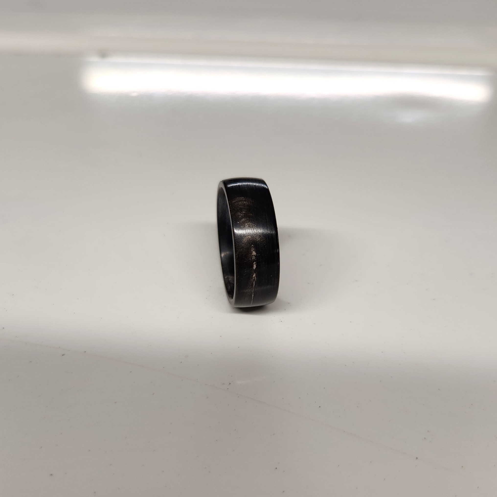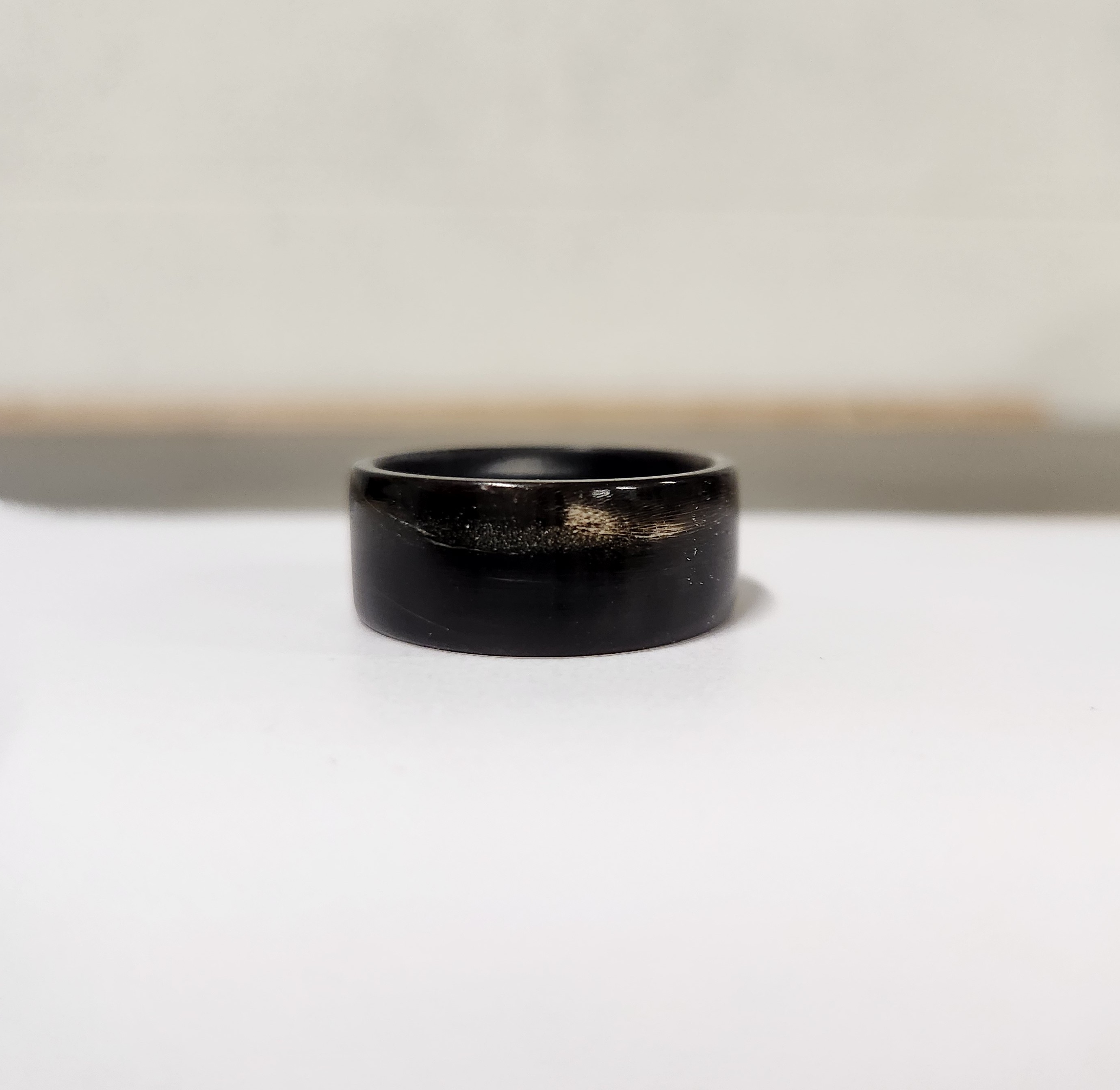 This is my Original Buffalo Horn Ring design. No stains or dyes. No chemicals to harm your skin. Just 100% natural African water buffalo horn. This ring will have unmatched comfort thanks to my fitment guarantee with true and accurate sizing. This ring is noticeably lighter than typical metal rings yet, still very durable. You will forget you are even wearing it. The wide flat profile of this ring is 6-7mm wide depending on your size and has a band thickness of 2-2.5mm also depending on your size. The color and character varies with each cut of horn.